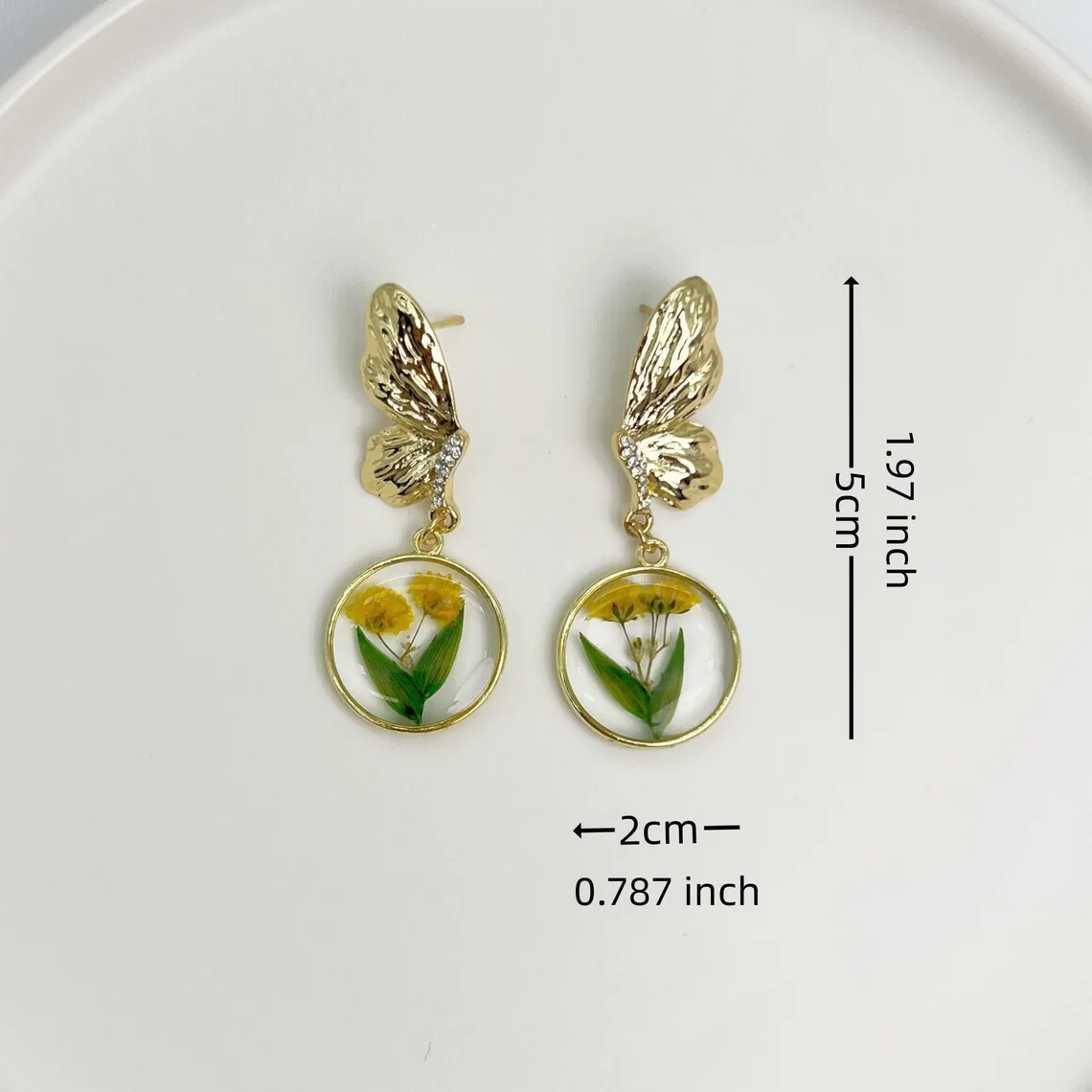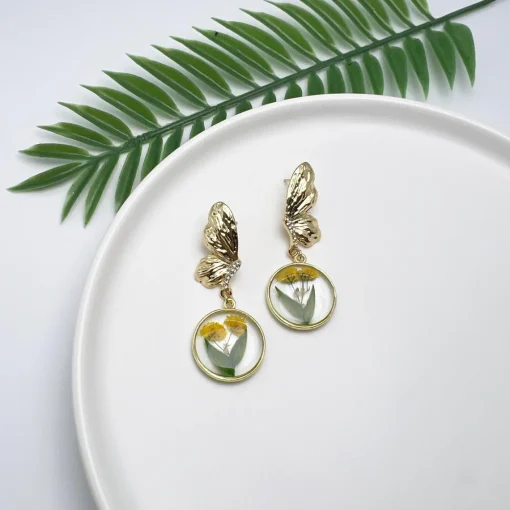 Each pair of earrings is carefully crafted by hand, ensuring that every detail is perfect. The yellow flowers are carefully selected for their beauty and then preserved in resin to maintain their natural vibrancy. The butterfly adds a touch of whimsy and elegance to the design, making these earrings perfect for any occasion.